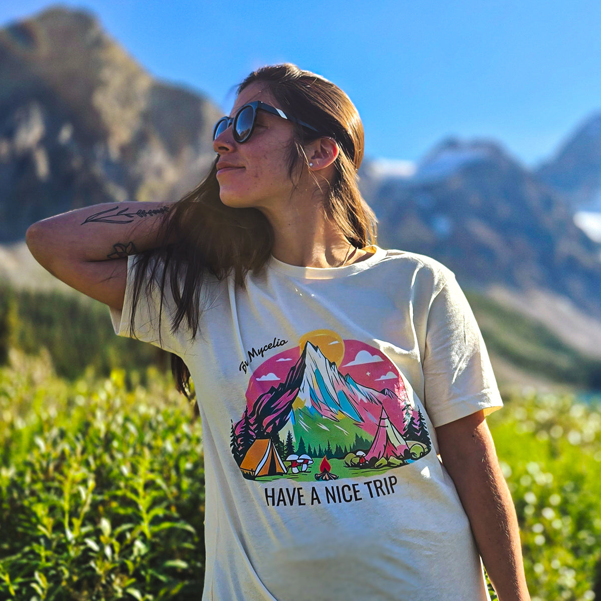 A dreamy blend of nature and psychedelia, glowing peaks, magic mushrooms, and tent-side sunsets. Perfect for wanderers, daydreamers, and those who like their trips a little… colorful. Have a nice trip.